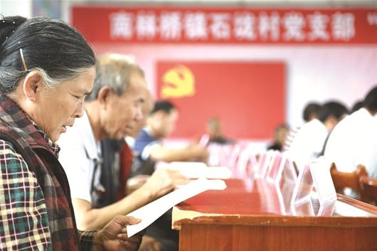 通山縣南林橋鎮(zhèn)石垅村黨支部開展支部主題黨日活動,黨員共同誦讀黨章。