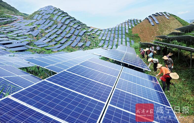 10日,在通山縣燕廈鄉(xiāng)理畈村地面光伏發(fā)電站,當(dāng)?shù)卮迕裨跒殡娬境荨?/p>