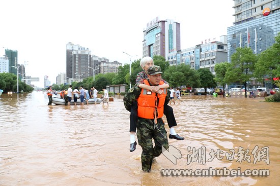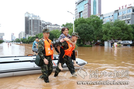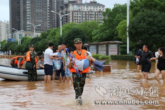 湖北日?qǐng)?bào)網(wǎng)訊(通訊員何智利、何彥卿、記者江卉)8月11日20時(shí)至8月13日12時(shí),咸寧地區(qū)普降大到暴雨,局部特大暴雨量達(dá)204.7毫米。強(qiáng)降雨導(dǎo)致城區(qū)咸寧大道、銀泉大道、玉泉街、書臺(tái)街等多條城市主干道嚴(yán)重積水,造成嚴(yán)重內(nèi)澇。8月13日13時(shí)許,武警咸寧支隊(duì)接到任務(wù)后,支隊(duì)長廖光明率50名官兵,出動(dòng)車輛6臺(tái)、救援繩20根、皮劃艇3艘,轉(zhuǎn)移受災(zāi)群眾300余人,轉(zhuǎn)運(yùn)受損拋錨車輛20余臺(tái),疏通城市主干道5條。截止13日18點(diǎn),武警官兵還在一線救援。