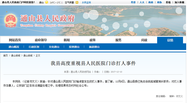 據(jù)通山縣委宣傳部通報:2017年12月8日中午,通山縣人民醫(yī)院門診輸液室發(fā)生打人事件 ,通山縣公安局及時出警調查取證。事件發(fā)生后,通山縣委、縣政府高度重視,組建專班進行處置,召集縣政府應急辦、 公安局、衛(wèi)計局、縣人民醫(yī)院等部門負責人會議:由縣人民醫(yī)院院長成忠了負責組建醫(yī)療專班,做好治療護理工作;由縣 人民政府副縣長金大德負責組建公安調查專班,確保處置及時快速、公平公正。該事件正在調查處置中,處置結果將及時 向社會公布。