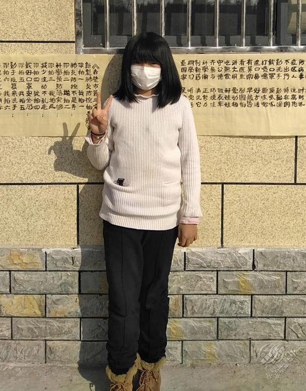 這幅《新型肺炎防控拍手歌》出自神山鎮(zhèn)蓮塘村年僅10歲的漆家萱小朋友之手。漆家萱有著一頭烏黑亮麗的秀發(fā),雖然戴著口罩但仍遮掩不住她的活潑開朗,身后這副長長的毛筆字疫情防護宣傳墻貼,是她自發(fā)完成的。