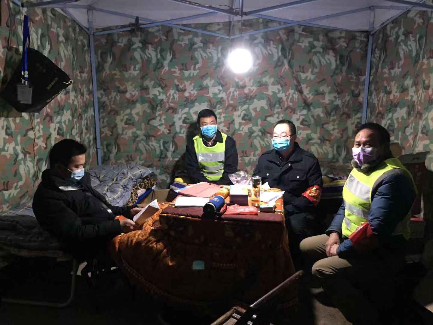 義源村的另一處臨時關(guān)卡點(diǎn),16名黨員干部憑著幾把凳子,幾床被褥堅(jiān)守陣 地,從1月25日開始, 24小時輪班執(zhí)勤,對外來人員車輛進(jìn)行勸返消毒,嚴(yán)防死守, 為全村疫情防控工作構(gòu)筑了一道牢固的安全網(wǎng)、防護(hù)欄。