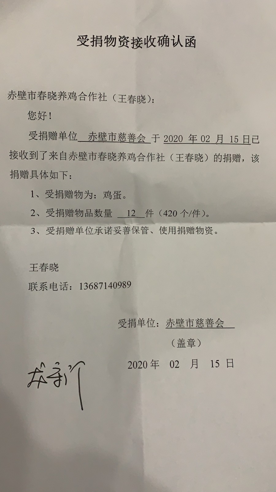 據(jù)悉,赤壁市意豐農(nóng)業(yè)合作社捐贈(zèng)大米3噸,赤壁市春曉養(yǎng)雞合作社捐贈(zèng)雞蛋5040枚,赤壁市浚龍養(yǎng)雞場(chǎng)捐贈(zèng)雞蛋7200枚。