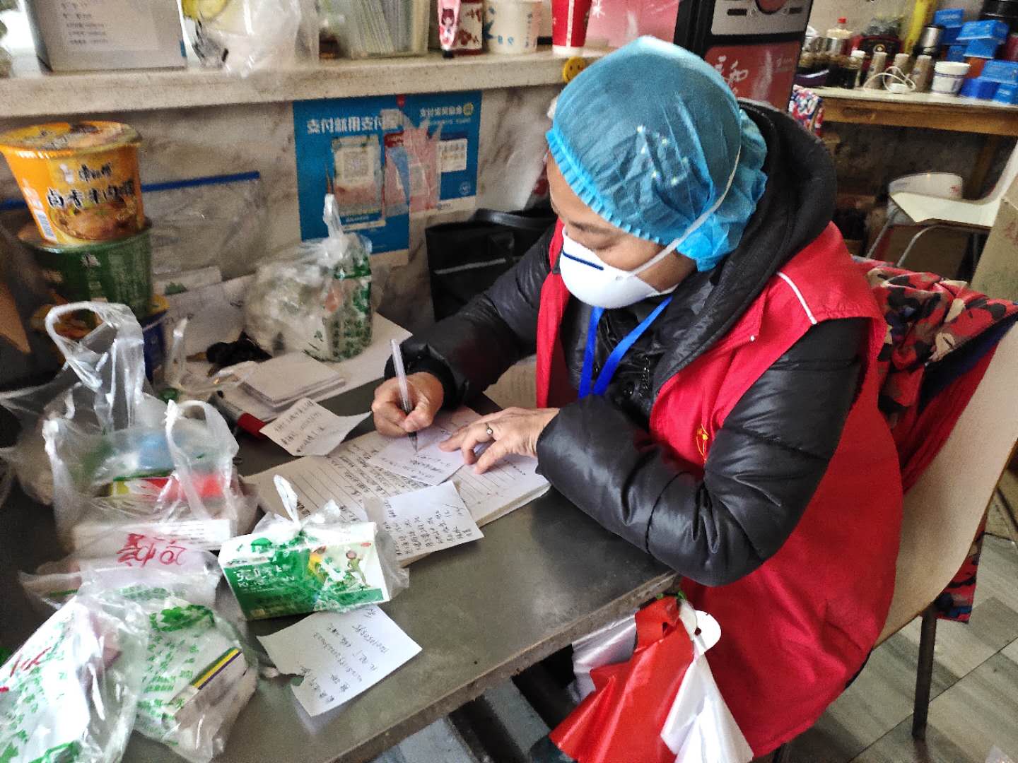 張斌翔負責清點定點超市配送的物資,他對照清單點清、收貨,然后發(fā)放、收款,每天開著三輪車送貨,最早到崗,最晚回家。下大雪那天,晚上七點多,送完最后一家生活物資返回時,因天黑路滑,車撞到護攔上,他的頸部受傷,腿也摔腫了。他忍痛回家,簡單處理傷口,第二天早晨八點,又出現在供應點上。大家讓他休息,他說,輕傷不下火線,供應點少一個人,就更忙不過來,堅持不肯離開。