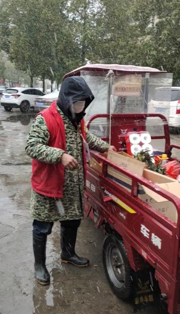 何正武負責整個小區(qū)生活保障物資配送、廣播宣傳巡查、樓棟排查。15日,他為20多戶居民送來訂購的菜,風雪中,他在門衛(wèi)足足等了兩個多小時,最后只等來了三位居民前來拿走預訂的菜。盡管如此,他還是一如既往,做好物資配送等各項工作。