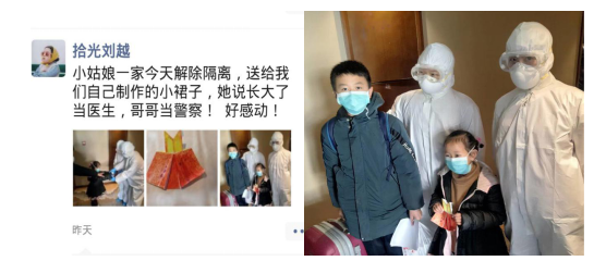隔離解除,依依惜別,萌娃兄妹把精心制作的手工,送給日夜相伴的“拾光劉越”等醫(yī)護人員?!伴L大也要當醫(yī)生、當警察?!敝蓺獾脑捳Z,讓“拾光”感動。