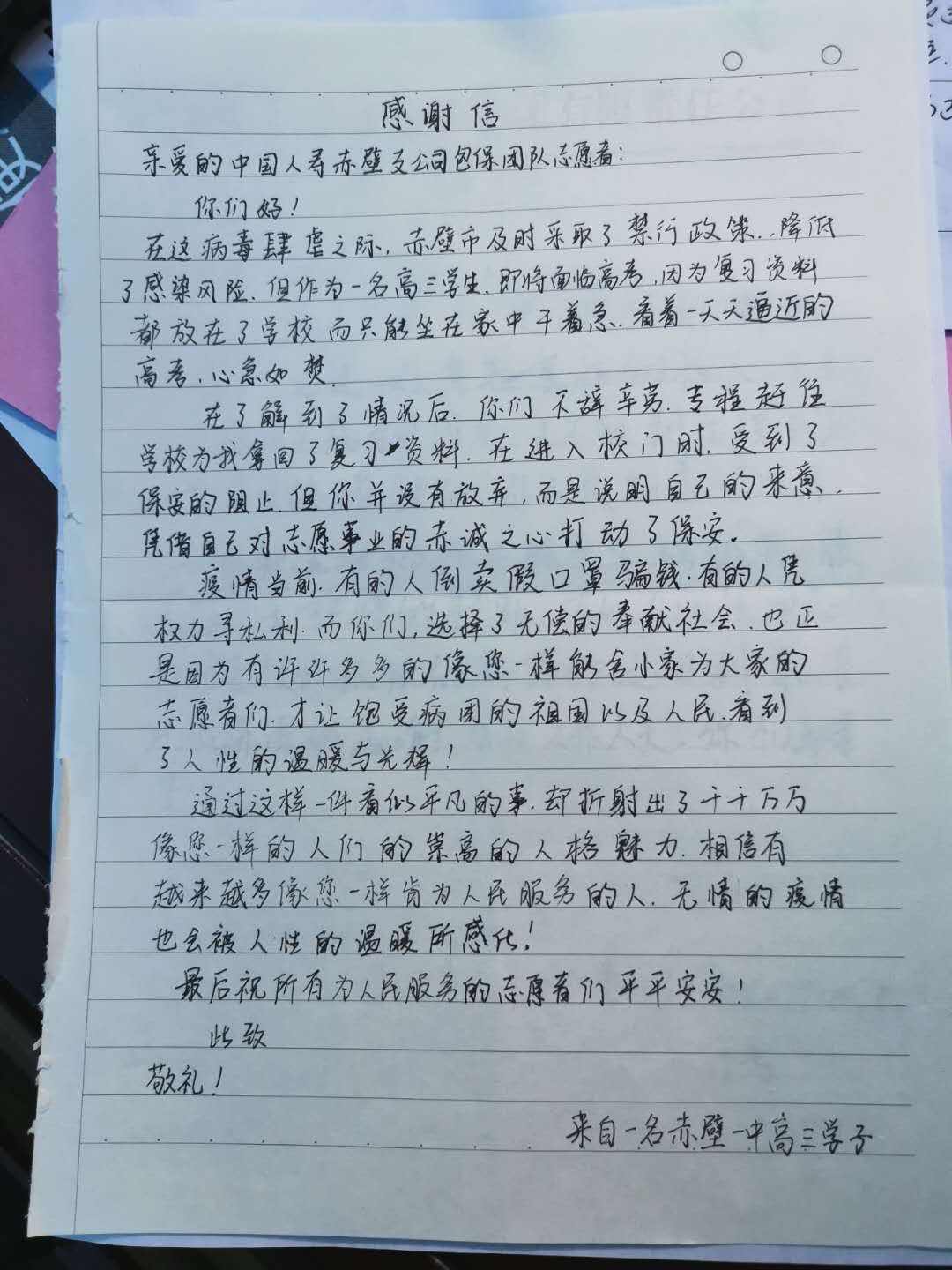 “作為一名即將面臨高考的高三學(xué)生,因?yàn)閺?fù)習(xí)資料都放在了學(xué)校而只能坐在家中干著急。看著一天天逼近的高考,心急如焚!謝謝你們不辭辛勞,專程趕往學(xué)校為我拿回了復(fù)習(xí)資料……”這是一名高三學(xué)生寫給小區(qū)包保單位中國(guó)人壽赤壁支公司的一封感謝信。這樣的感謝信該公司還收到很多,有感謝聯(lián)系車輛為患者買藥的,有感謝為他們購(gòu)買奶粉等生活物資的……