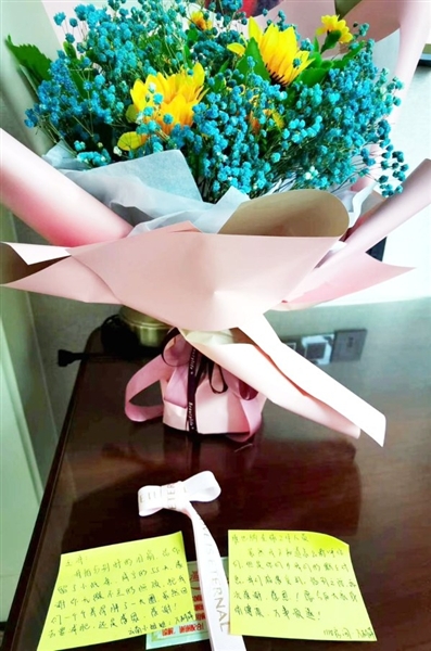 自稱為“云南小姐姐”的萬麗萍,將一束開得正艷的花和兩張小紙條擺在桌上?!坝窀?,我怕分別時(shí)的淚崩,給你留了小紙條。咸寧的55天,感謝你無微不至的照顧,把我們一個(gè)個(gè)養(yǎng)得胖了一大圈。雖然回去要減肥,還是感恩、感謝!”