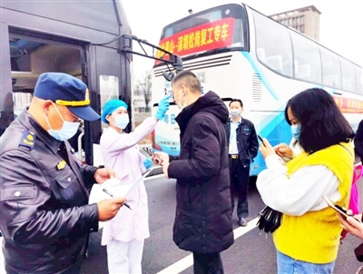 檢查身份信息、核驗健康綠碼、監(jiān)測體溫、消毒……在現(xiàn)場工作人員的組織下,所有返崗復工人員有序上車。