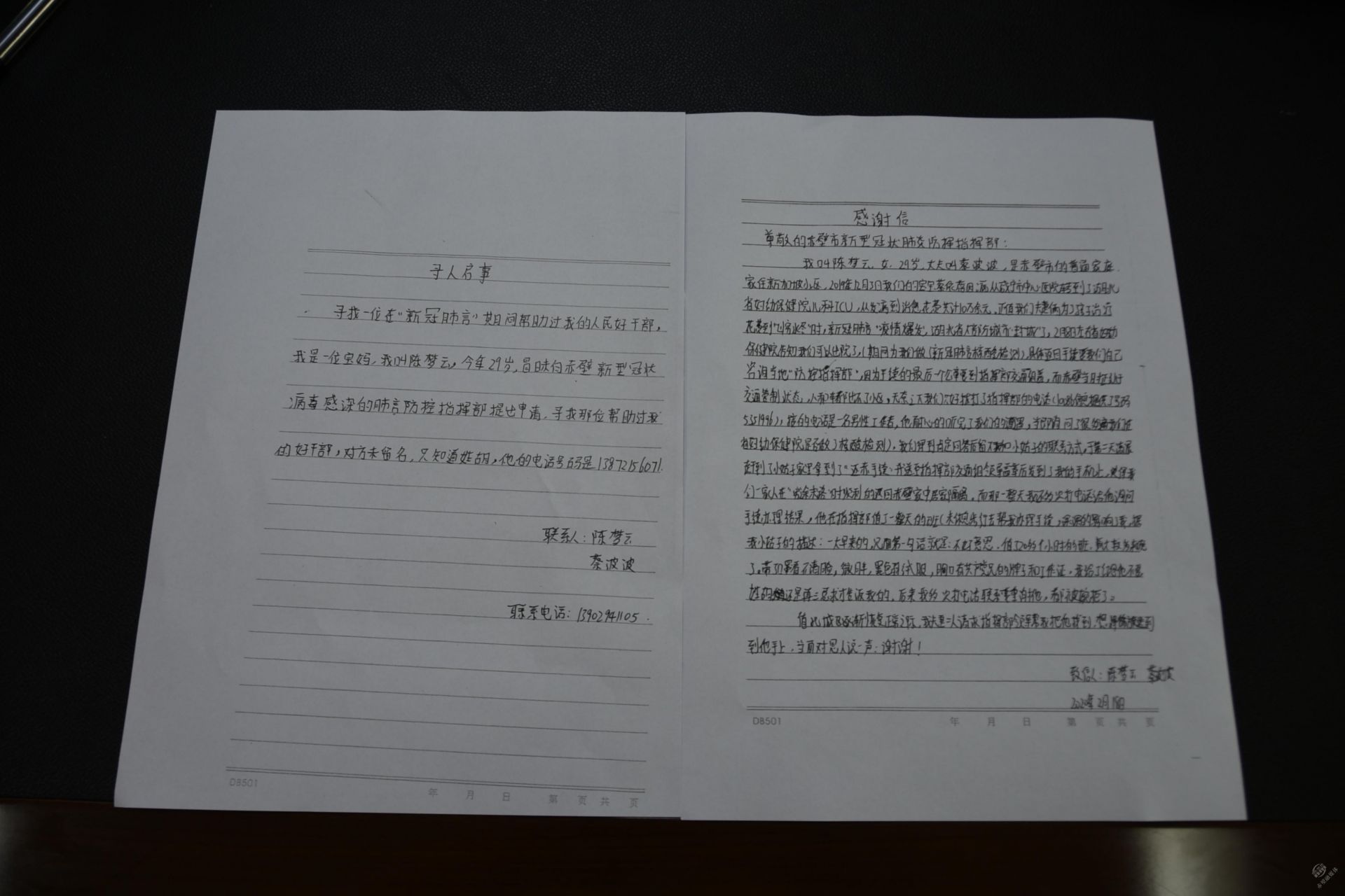 夫妻二人一直對(duì)這位胡姓同志十分感激,2月18日,陳夢(mèng)云給市疫情防控指揮部寫了一封感謝信,同時(shí)希望他們能幫忙找到那位胡姓同志以便表示感謝。經(jīng)過(guò)一個(gè)半月的尋找,4月6日,夫妻二人終于得知——胡明浩,市衛(wèi)健局人事股科員,于是給其所在市新冠肺炎疫情防控指揮部送上錦旗。