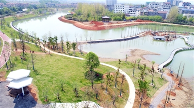 “正在加緊施工,力爭五一開園?!笔┕挝恢薪ㄈ窒虒庝坪禹椖恐笓]長劉長奇介紹,整個公園有5萬余平方米,2018年8月30日動工至今,已完成水下防洪水利工程和東岸園建綠化鋪裝,目前濕地公園項目已進入收尾階段。