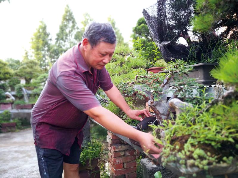 30多年來,孫勝望每天堅(jiān)持下班后給盆景澆水,家里的走廊過道、院子里,平頂上密密麻麻全是擺放的盆景。最多時(shí)他的盆景達(dá)2000多盆,成了遠(yuǎn)近聞名的“盆景大戶”。僅澆水每天就要花費(fèi)半天工夫,幾乎每個(gè)晚上他都要打著手電筒堅(jiān)持把水澆完?!皾菜孟蠼o嬰兒喂水,施肥好比喂奶,修枝好比剪指甲,而打農(nóng)藥則是給他們治病……”在他心目中,每一個(gè)盆景都是一個(gè)嗷嗷待哺的嬰兒,孫勝望總是悉心照料,精心呵護(hù)。