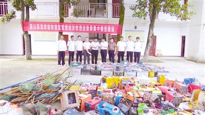 合力“嚴(yán)管”形成高壓。7月中旬以來,組織執(zhí)法行動211次,出動執(zhí)法船艇和車輛230臺次,參與執(zhí)法人員1031人次,現(xiàn)場查獲并銷毀各類非法漁具632套、違法電捕設(shè)備21臺(套),查扣非法捕撈漁船2 艘,行政處罰54人,行政罰款1.4萬元,批評教育300余人,刑事立案1起,形成了有效震懾。