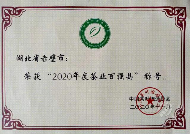 11月18日,第十六屆中國(guó)茶業(yè)經(jīng)濟(jì)年會(huì)正式發(fā)布了2020中國(guó)茶葉行業(yè)調(diào)查的最終結(jié)果,對(duì)年度中國(guó)茶業(yè)優(yōu)秀企業(yè)、優(yōu)秀縣域進(jìn)行授牌表彰。赤壁市榮獲“十三五百?gòu)?qiáng)縣市十強(qiáng)”和“2020年度茶業(yè)百?gòu)?qiáng)縣”稱號(hào),其中“十三五百?gòu)?qiáng)縣市十強(qiáng)”中赤壁市是湖北省唯一入選的縣市,在“2020年度茶業(yè)百?gòu)?qiáng)企業(yè)”評(píng)選中,羊樓洞茶業(yè)股份有限公司成為咸寧市唯一入選的企業(yè)。