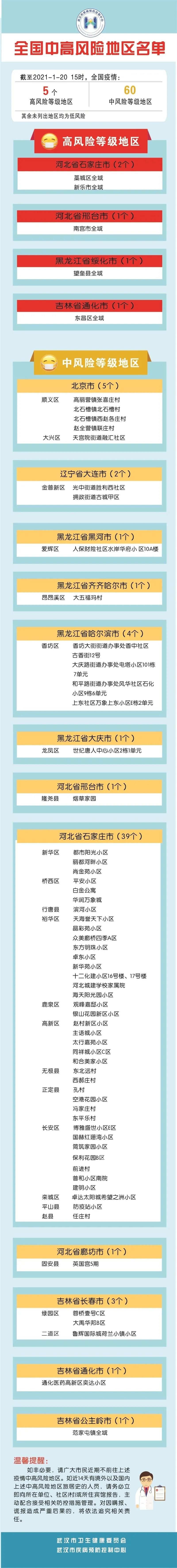 截至今日(1月20日)15時,全國高風險等級地區(qū)較昨日增加1個,中風險等級地區(qū)較昨日減少2個。