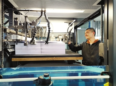 3月3日,記者在山河文化發(fā)展有限公司看到,車間里機(jī)聲隆隆。在一個大型流水機(jī)器旁,一名員工專注地放紙,隨后機(jī)械打印、切割、檢驗、裝訂成書……人機(jī)配合十分默契。