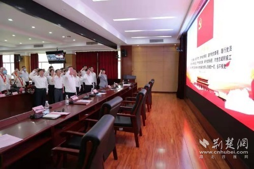 表彰結束后,會議室內(nèi)響起鏗鏘誓言。新黨員代表集體宣誓、老黨員重溫入黨誓詞。