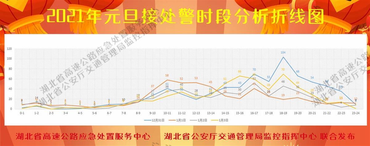 根據(jù)湖北省公安交管局監(jiān)控指揮中心對2021年接警統(tǒng)計歷史數(shù)據(jù)分析,從元旦假期警情時段分布來看,警情高峰期多發(fā)生于12月31日16時至20時,節(jié)日期間8時至12時、14時至18時;警情數(shù)量與交通流量成正比。