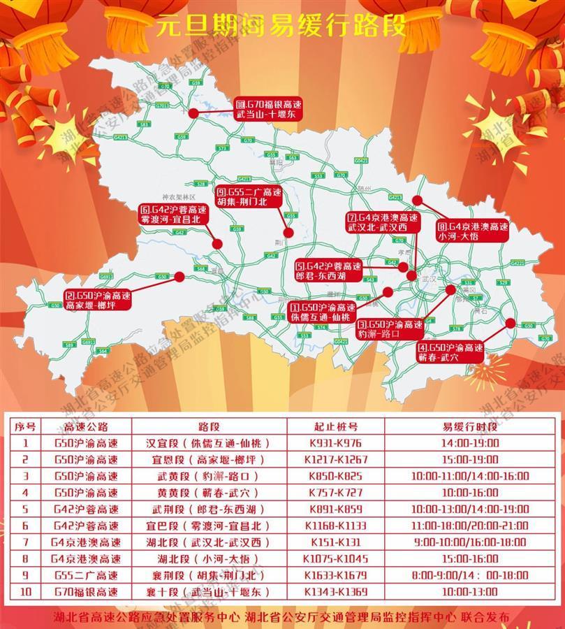 預計元旦期間,全省高速公路重點通道的車流量將顯著上升,國高網(wǎng)路段及武漢市周邊重點收費站易發(fā)生緩行情況。具體易緩行路段和武漢周邊車流量大收費站如圖所示:
