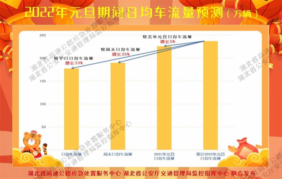 根據(jù)湖北省交通運輸廳高速公路管理局對歷年來高速公路路網(wǎng)運行動態(tài)分析,“元旦”期間路網(wǎng)流量主要以短途出行為主,屆時社會公眾走親訪友、旅游度假等出行需求相對集中,全省高速公路車流量較日常將有明顯增長,部分路段及站口出行壓力將有所上升。