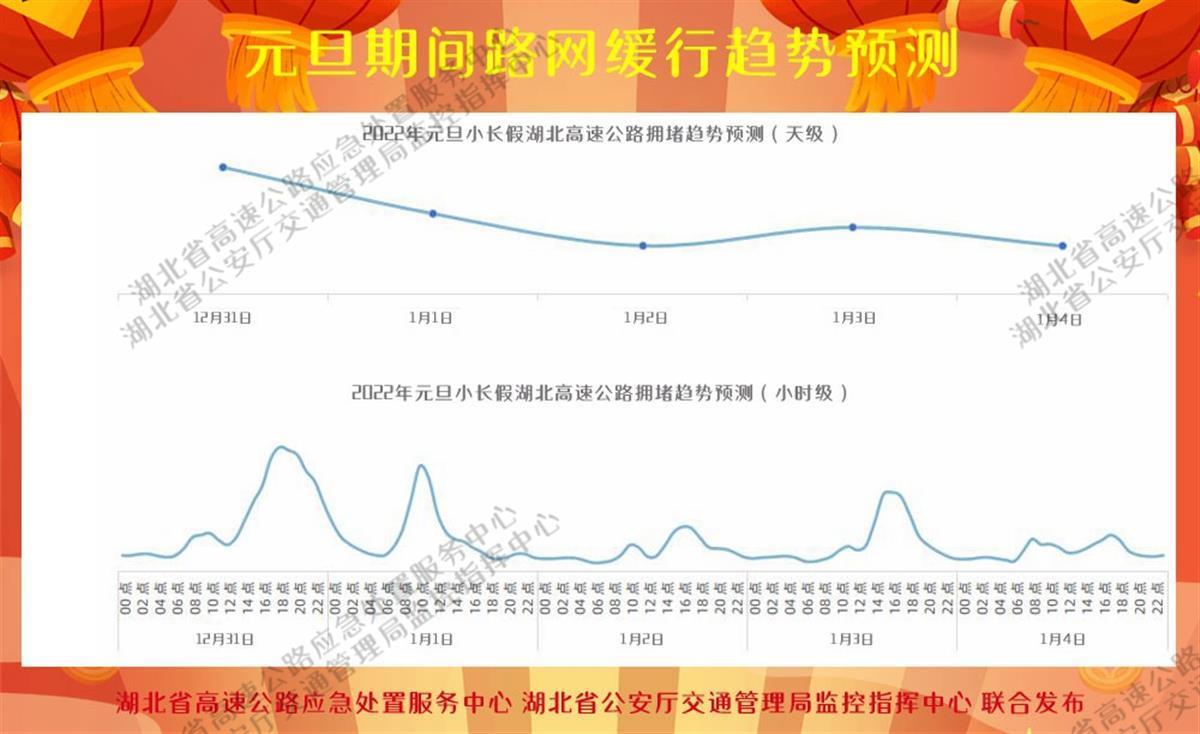 根據(jù)湖北省高管局應急處置服務中心對往年高速公路路網(wǎng)運行數(shù)據(jù)分析,元旦假期高速公路路網(wǎng)整體車流量將呈現(xiàn)“前高后低、逐日下降”態(tài)勢。預計部分公眾選擇提前出行,從2021年12月31日16時起,全省高速公路車流量將逐漸增長,18時左右出現(xiàn)第一波去程小高峰,主要由城市向周邊縣市擴散,城市進出口流量激增,城市周邊收費站車流量可能呈井噴態(tài)勢,較易發(fā)生緩行和擁堵現(xiàn)象,2022年1月1日(假期首日)10時左右預計出現(xiàn)出行高峰,元旦假期返程車流將趨于平穩(wěn)。