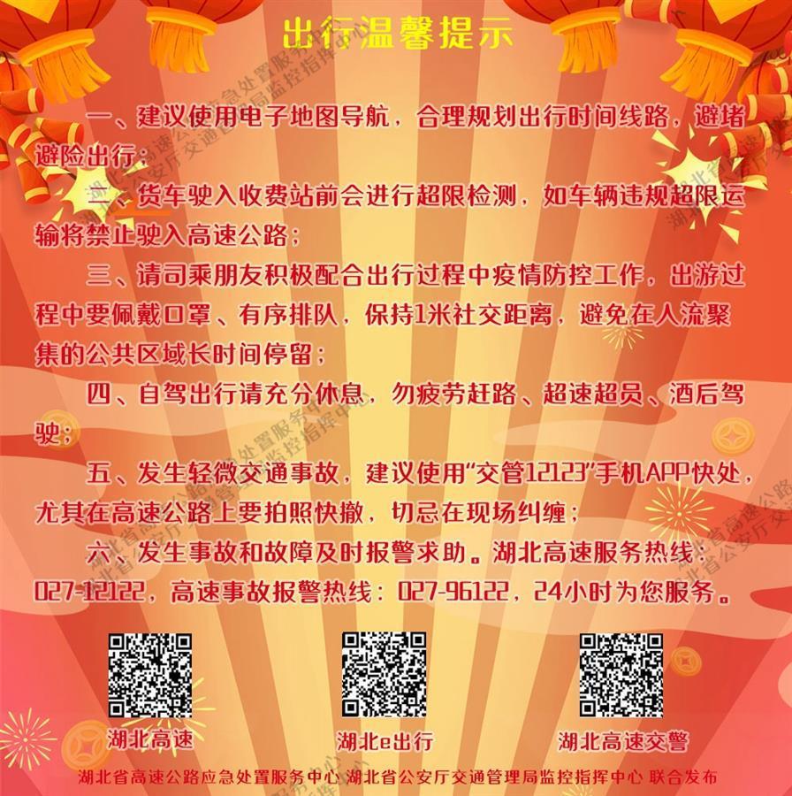湖北省交通運輸廳高速公路管理局建議廣大公眾提前合理安排出行線路,科學避開擁堵路段,出行途中也可使用各類導航軟件,隨時關(guān)注“湖北高速”“湖北e出行”微信公眾號、微博發(fā)布的信息,或撥打027-12122湖北高速服務熱線了解路況。