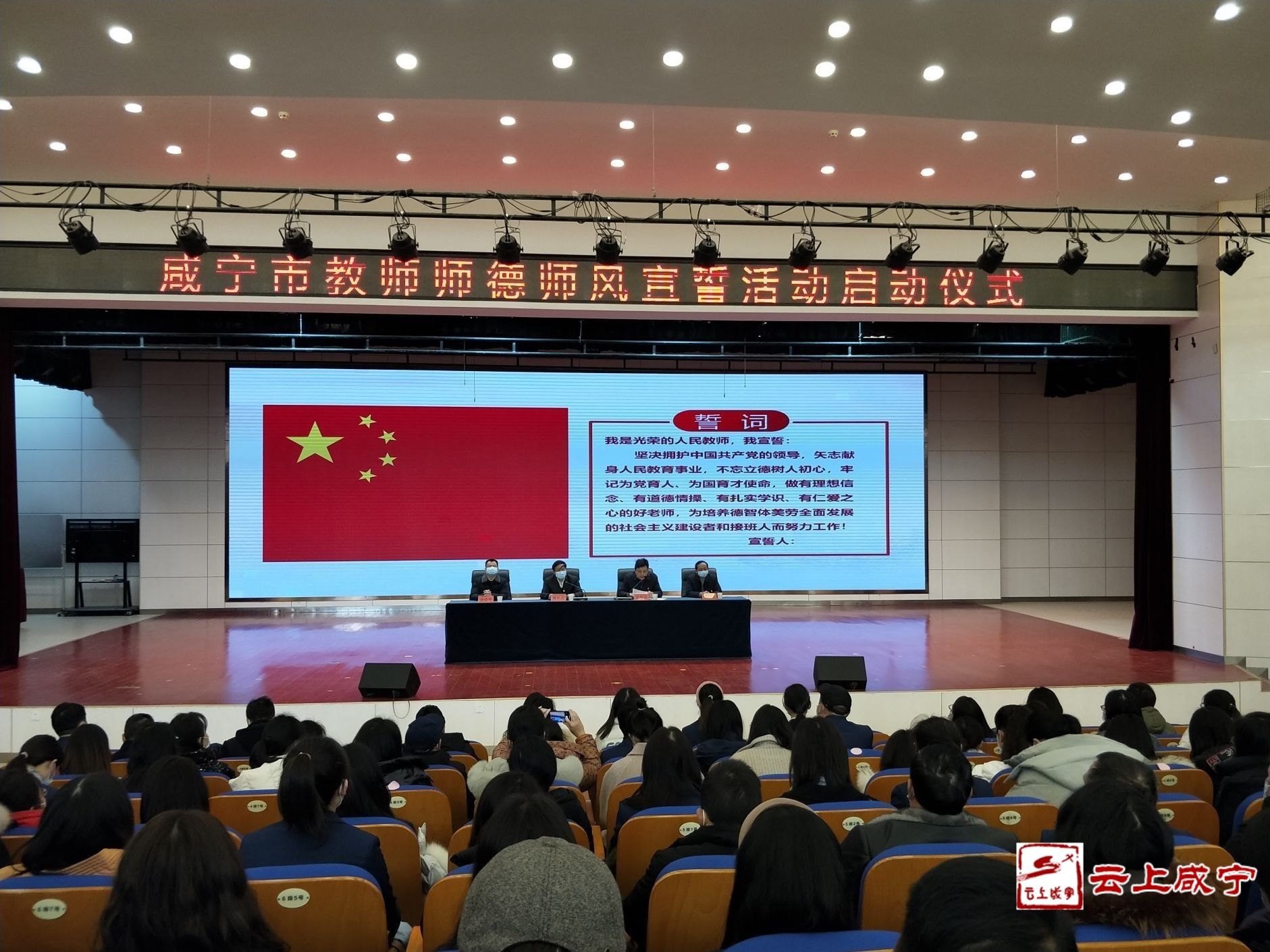 “我是光榮的人民教師,我宣誓……”1月19日上午,啟動(dòng)儀式在市實(shí)驗(yàn)小學(xué)報(bào)告廳舉行,咸寧市溫泉中學(xué)、咸寧市實(shí)驗(yàn)小學(xué)所有在職教師面向國旗、莊嚴(yán)宣誓:牢記為黨育人、為國育才使命,做“四有”好老師。