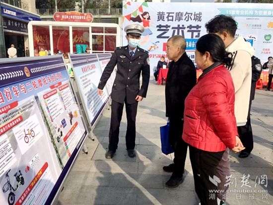當(dāng)天上午,交巡警黃石港大隊(duì)、黃石港區(qū)城管局、黃石港區(qū)市場監(jiān)督管理局等多部門集中“擺攤”,現(xiàn)場解答群眾法規(guī)、上牌、停放、保險(xiǎn)等方面疑問。