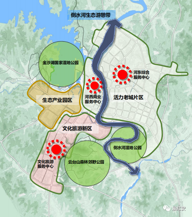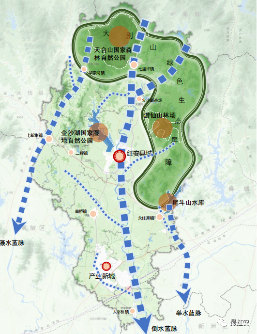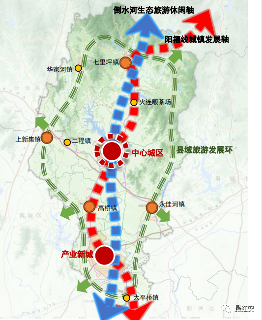 ? 雙城:中部紅安縣城、南部產(chǎn)業(yè)新城