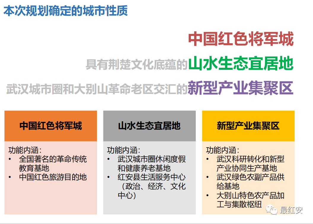 《紅安縣國(guó)土空間總體規(guī)劃(2020-2035年)》初步方案確定的紅安城市性質(zhì)為中國(guó)紅色將軍城、山水生態(tài)宜居地、新型產(chǎn)業(yè)集聚區(qū)。