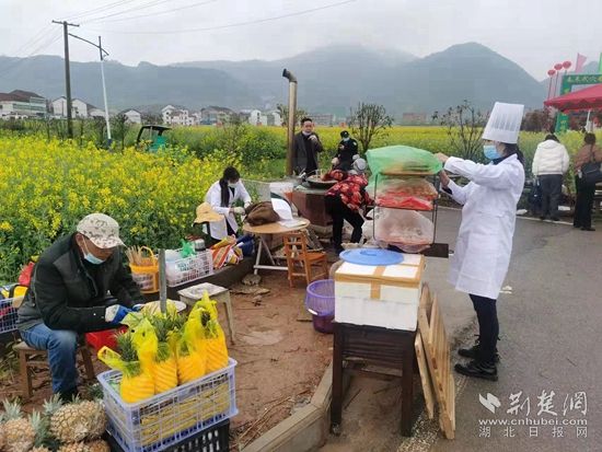 在發(fā)展鄉(xiāng)村旅游產(chǎn)業(yè)方面,大法寺鎮(zhèn)持續(xù)謀劃上桂、八峰、梅均、李邊等村特色產(chǎn)業(yè)基地的打造,精心制作了桂家畈主景區(qū)的油菜花海景觀,通過(guò)旅游節(jié)的農(nóng)副產(chǎn)品銷售,農(nóng)家樂(lè)、民宿的三產(chǎn)效益,提高農(nóng)民種油積極性,加強(qiáng)油菜產(chǎn)業(yè)發(fā)展以及美麗鄉(xiāng)村的提檔升級(jí)。游客在花海中通過(guò)抖音與粉絲互動(dòng),周邊村居的姑娘、小伙子們?cè)谘鼐€叫賣著油果、油面、油粑、蜂蜜等特色農(nóng)產(chǎn)品,形成一道亮麗的風(fēng)景線。
