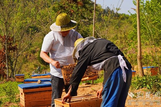 為此,他挨家挨戶做工作,流轉了村民270畝荒山荒地,引進了40年蜂齡的專業(yè)養(yǎng)蜂人,前往周邊養(yǎng)蜂基地討教,前往華中農(nóng)業(yè)大學請教學習,經(jīng)過半年發(fā)展,風橋村的蜂蜜事業(yè)漸成氣候。