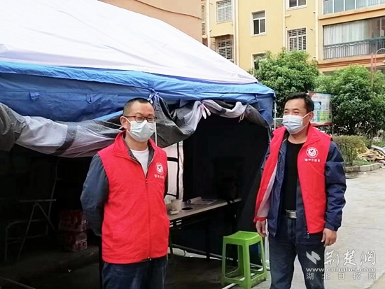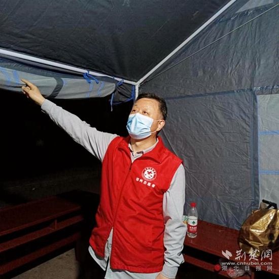 4月12日,實施靜態(tài)管理的第三天,鄂州天氣突變,氣溫驟降十余度。樊友明和羅福齊一同負(fù)責(zé)當(dāng)晚的夜班,夜里風(fēng)雨交加,臨時搭建的帳篷有些不穩(wěn)固,在風(fēng)雨中飄搖。雨越下越大,帳篷開始漏水,倆人幾乎一宿沒睡。第二天早上,幫助加固好帳篷,樊友明才匆匆離開。
