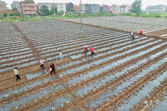 種植基地里,工人們頭戴草帽,在松土整地、地膜覆蓋,一張張流著汗水的臉上掛滿笑容?!霸谶@里務(wù)工,他們能流一分汗賺一分錢?!泵癜驳牡讱鈦碓从凇八慕鹉J健薄?/p>