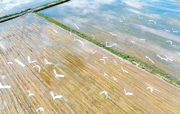 日前,記者在房縣軍店鎮(zhèn)上茅坪村看到,一群白鷺在千畝生態(tài)稻田上空翩翩飛舞。近年來,該縣牢固樹立“綠水青山就是金山銀山”發(fā)展理念,大力推廣綠色高質高效水稻生產模式,減少農藥和化肥使用量,生態(tài)環(huán)境不斷改善,吸引多種鳥類棲息繁殖。