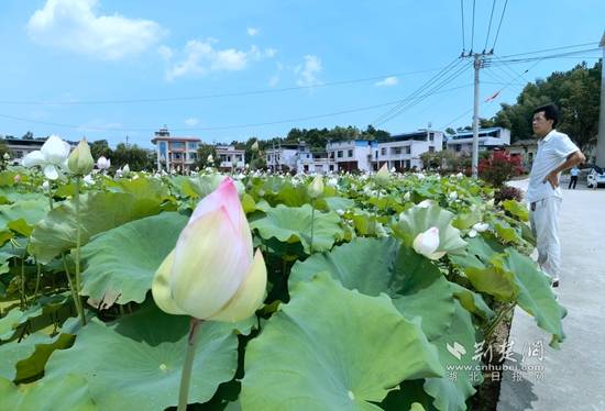 漫步在9組,17戶人家,家家戶戶門口都有一個(gè)“口袋花園”,觀賞花木,假山流水,不一而足;灣組中央盆地,“紅旗園林”已經(jīng)成型,風(fēng)吹柳樹,萬條絲絳隨風(fēng)而動,不遠(yuǎn)處,藍(lán)天白云籠罩下,400畝蓮藕基地中荷花正盛,粉的、白的、青的花瓣被層層疊疊碩大的荷葉襯托著,“美得一塌糊涂”。