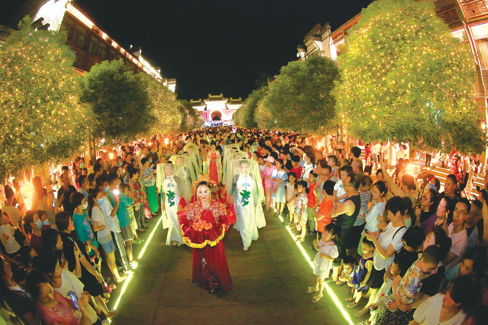 15日至16日晚,在武當山玉虛街舉行的非遺廟會,點亮夜經濟。除了極具看點的武當非遺文化展演,無人機天幕秀也令人震撼,此外,琳瑯滿目的美食極大滿足了游客的味蕾體驗,紅火熱鬧的玉虛街已成為游客夜游武當?shù)拇蚩ǖ?。圖/記者 朱江 特約記者 范學峰