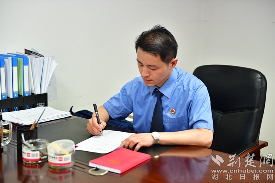 “他對待工作認真細致?!薄八恢痹谵k案一線?!薄八俏以阂幻嬉倭⒉坏沟募t旗?!蓖驴谥泻迷u不斷的他,是蘄春縣檢察院第三檢察部主任袁國斌,一名退伍老兵。
