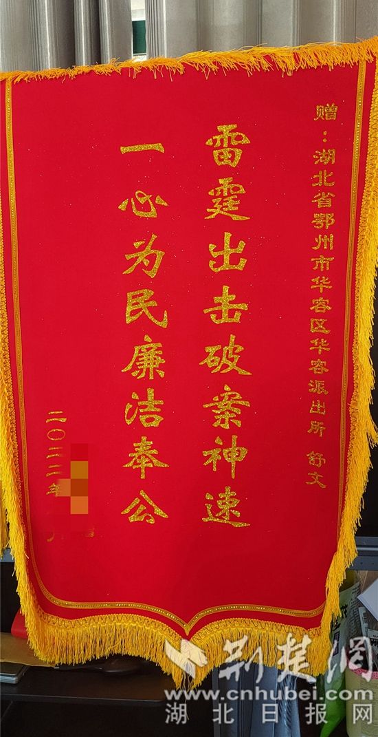 荊楚網(wǎng)(湖北日報網(wǎng))訊(通訊員 楊逸盟、林露 )8月1日下午,華容派出所一樓值班大廳收到一件來自吉林長春的郵寄包裹,郵遞員表示寄件人要求副所長舒文親自簽收。舒文帶著疑惑拆開封條,赫然入目的是一面印有“雷霆出擊破案神速、一心為民廉潔奉公”的16字紅色錦旗,另有一封600字的手寫感謝信,舒文看完后禁不住眼眶濕潤。