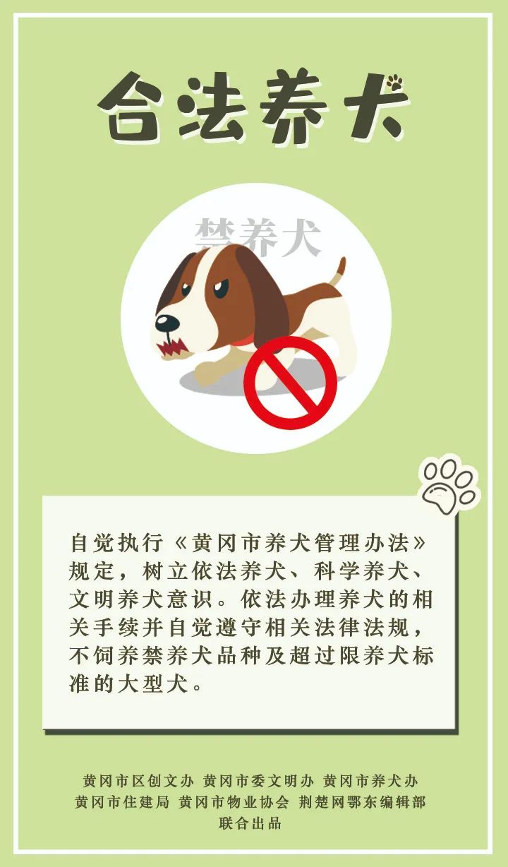 活動儀式上,黃岡市向廣大市民發(fā)出倡議:自覺依法文明養(yǎng)犬,共建和諧家園。做到合法養(yǎng)犬、文明養(yǎng)犬、衛(wèi)生養(yǎng)犬、安全養(yǎng)犬、健康養(yǎng)犬、科學養(yǎng)犬。