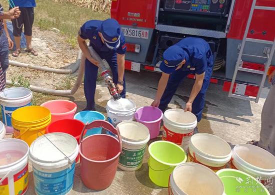消防人員到達占昌塆村后,迅速鋪設水帶、接好水槍、打開水閥,將水注入該村的公用蓄水池和前來挑水的村民水桶里,為村民送水12噸。