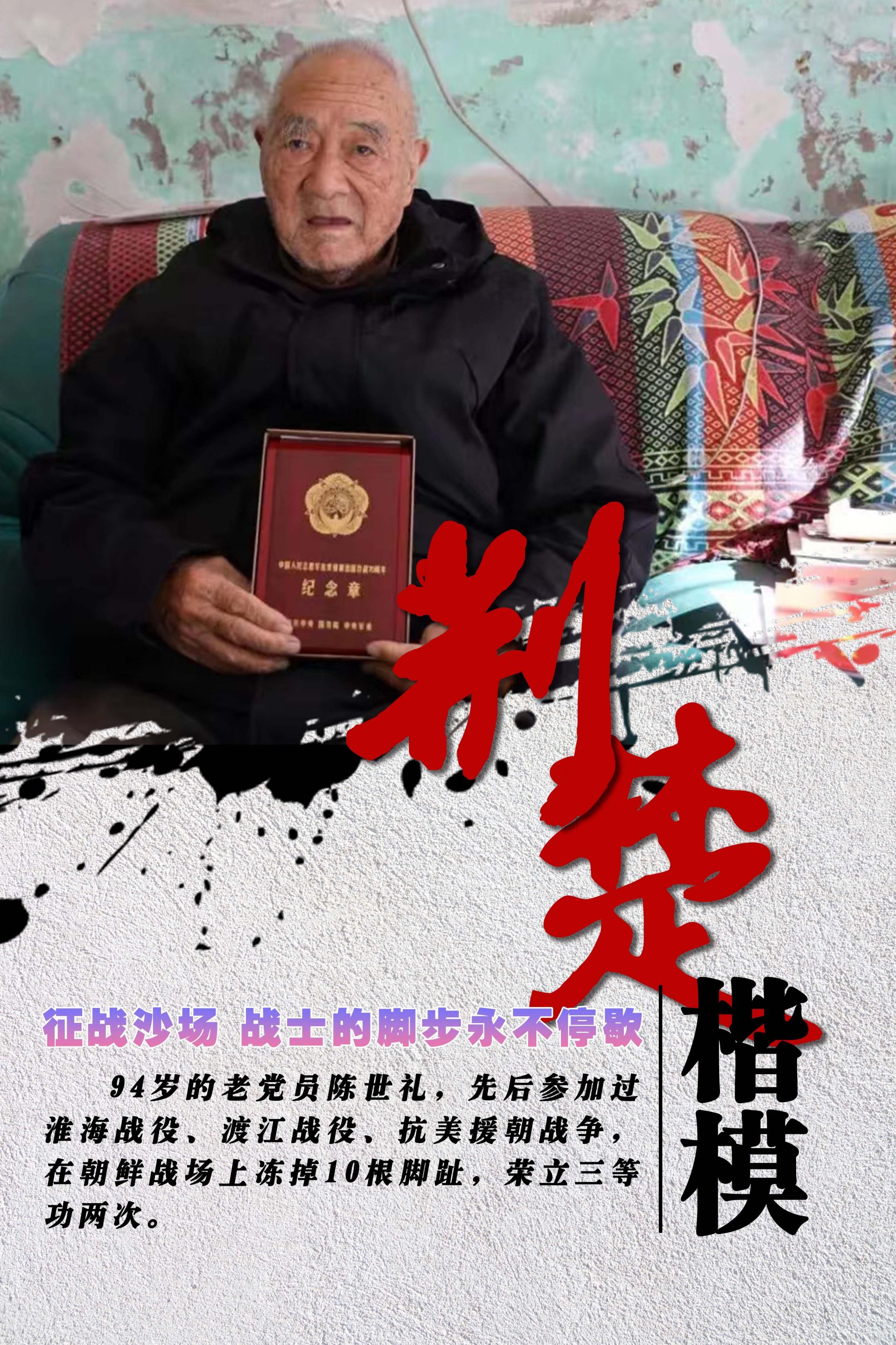 荊楚網(wǎng)(湖北日?qǐng)?bào)網(wǎng))訊(通訊員 殷霞)陳世禮,男,1928年5月生,中共黨員,原湖北省黃岡市黃州區(qū)面粉廠黨支部書記。他先后參加淮海戰(zhàn)役、渡江戰(zhàn)役、抗美援朝戰(zhàn)爭(zhēng),在朝鮮戰(zhàn)場(chǎng)上凍掉10根腳趾,兩次榮立三等功。1957年,陳世禮退役,主動(dòng)選擇回到家鄉(xiāng),在黃岡糧食系統(tǒng)工作數(shù)十年。70多年來(lái),他淡泊低調(diào),從不居功自傲、從不在人前顯耀。陳世禮曾榮獲“荊楚楷?!睒s譽(yù)。
