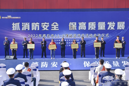 啟動(dòng)儀式上,黃石市消防救援支隊(duì)支隊(duì)長(zhǎng)程雄鷹部署了消防宣傳月相關(guān)工作,市委宣傳部副部長(zhǎng)丁元拾宣讀了《關(guān)于表彰全市優(yōu)秀消防志愿服務(wù)團(tuán)隊(duì)和消防宣傳志愿者的通報(bào)》,與會(huì)領(lǐng)導(dǎo)為獲獎(jiǎng)團(tuán)隊(duì)和個(gè)人代表頒發(fā)了獎(jiǎng)牌及證書(shū)。