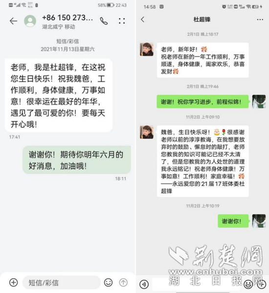 荊楚網(wǎng)(湖北日?qǐng)?bào)網(wǎng))訊(記者黃錚)“魏爸,生日快樂呀!很感謝老師以前的諄諄教誨,在我想要放棄時(shí)的鼓勵(lì)、懈怠時(shí)的敲打……”11月2日,通城縣一中魏剛老師收到到了這樣一條微信消息。連續(xù)兩年,他都收到了2021屆學(xué)生杜超鋒發(fā)來的生日祝福短信。