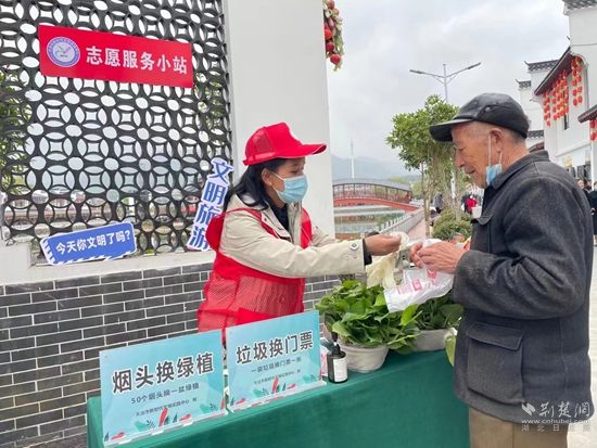 活動(dòng)現(xiàn)場(chǎng),大冶市新時(shí)代文明實(shí)踐中心還設(shè)置了志愿服務(wù)小站,開(kāi)展“垃圾換門(mén)票”“煙頭換綠植”的文明旅游主題活動(dòng)。