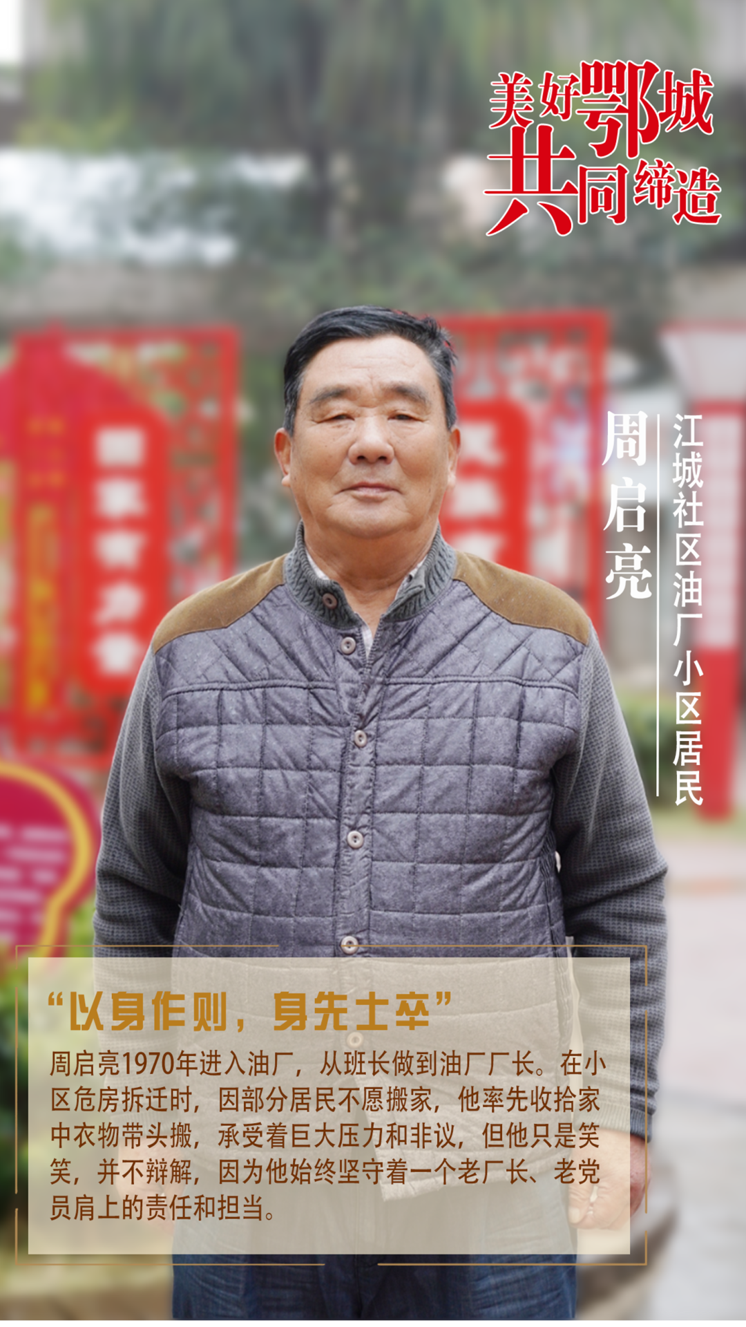 周啟亮1970年進(jìn)入油廠,從班長做到油廠廠長。在小區(qū)危房拆遷時,因部分居民不愿搬家,他率先收拾家中衣物帶頭搬,承受著巨大壓力和非議,但他只是笑笑,并不辯解,因為他始終堅守著一個老廠長、老黨員肩上的責(zé)任和擔(dān)當(dāng)。