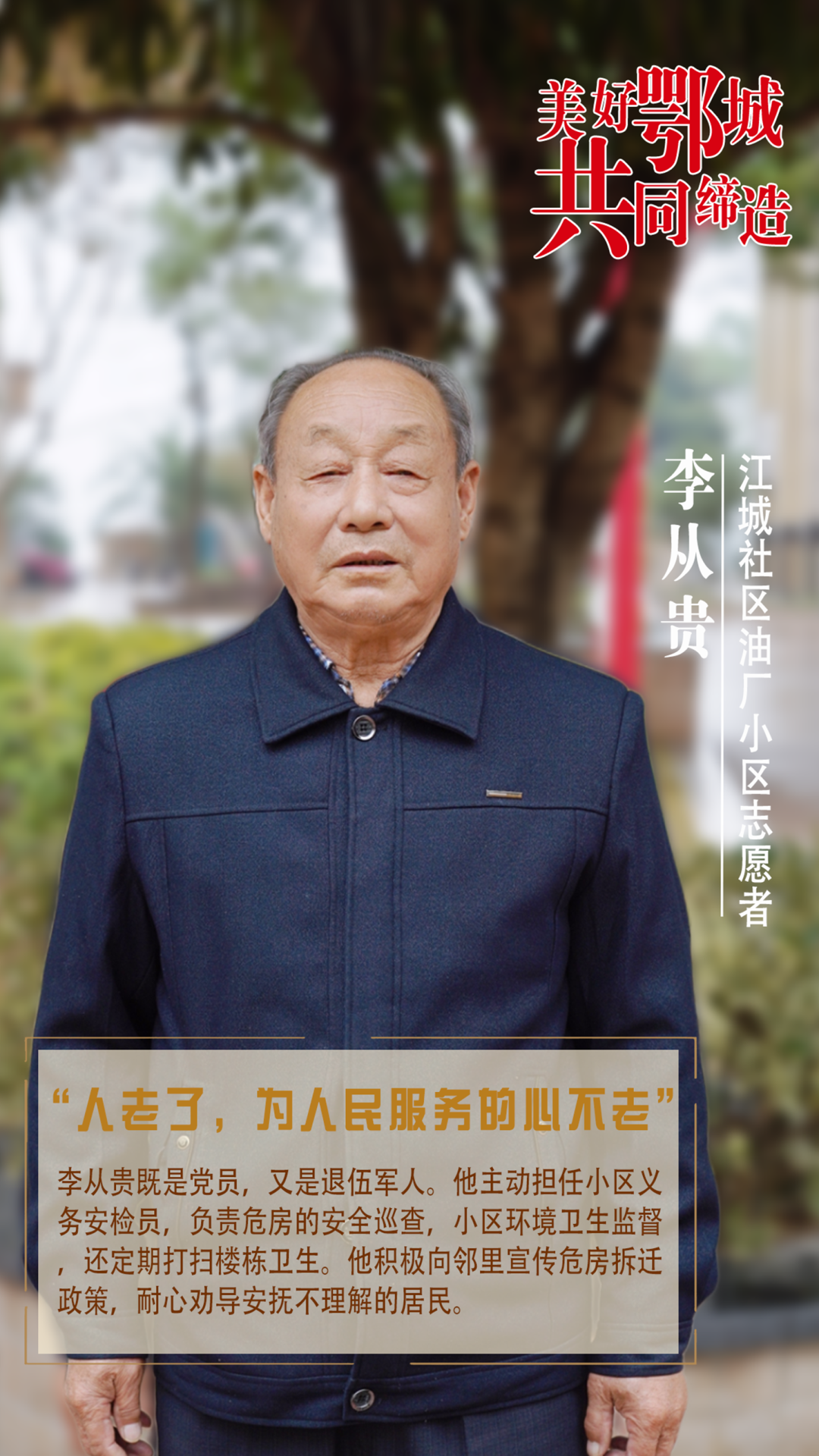 李從貴既是黨員,又是退伍軍人。他主動擔(dān)任小區(qū)義務(wù)安檢員,負(fù)責(zé)危房的安全巡查,小區(qū)環(huán)境衛(wèi)生監(jiān)督,還定期打掃樓棟衛(wèi)生。他積極向鄰里宣傳危房拆遷政策,耐心勸導(dǎo)安撫不理解的居民。