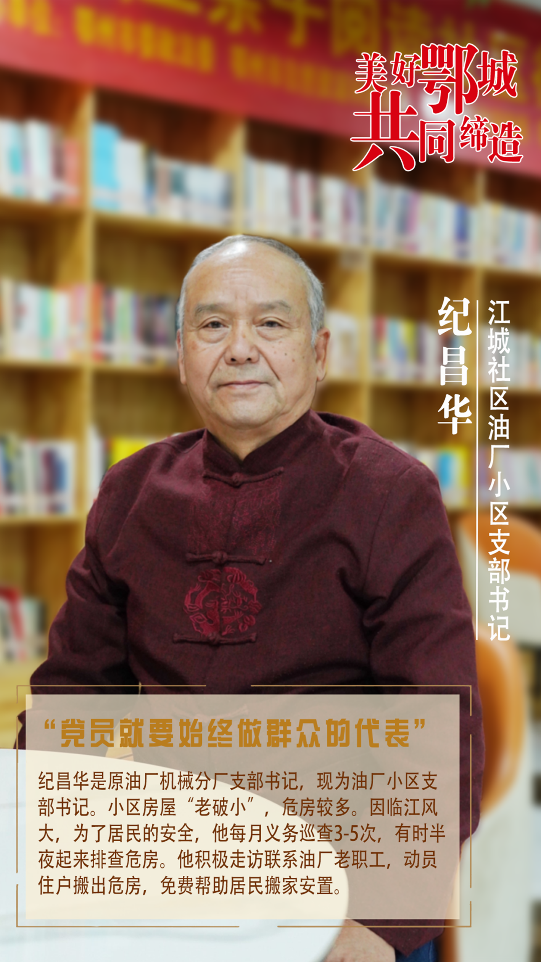 紀(jì)昌華是原油廠機(jī)械分廠支部書記,現(xiàn)為油廠小區(qū)支部書記。小區(qū)房屋“老破小”,危房較多。因臨江風(fēng)大,為了居民的安全,他每月義務(wù)巡查3-5次,有時半夜起來排查危房。他積極走訪聯(lián)系油廠老職工,動員住戶搬出危房,免費(fèi)幫助居民搬家安置。