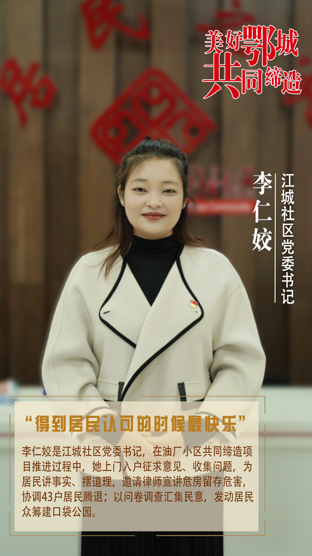 李仁姣是江城社區(qū)黨委書記,在油廠小區(qū)共同締造項目推進(jìn)過程中,她上門入戶征求意見、收集問題,為居民講事實、擺道理,邀請律師宣講危房留存危害,協(xié)調(diào)43戶居民騰退;以問卷調(diào)查匯集民意,發(fā)動居民眾籌建口袋公園。