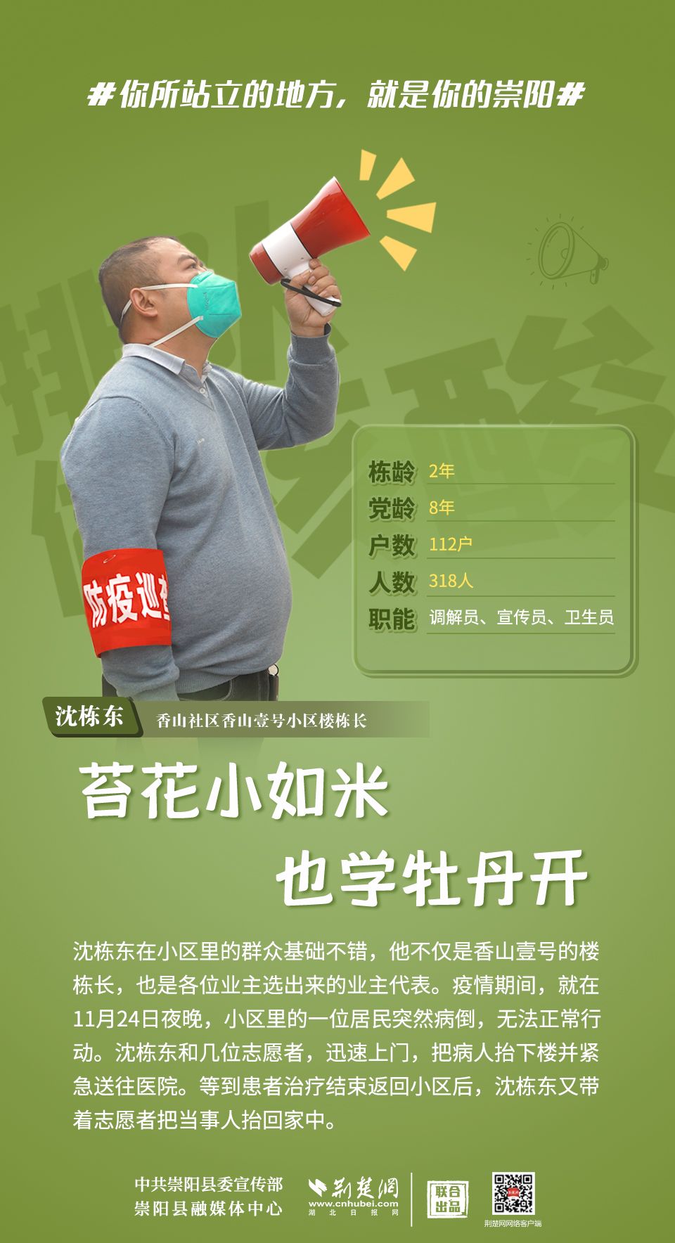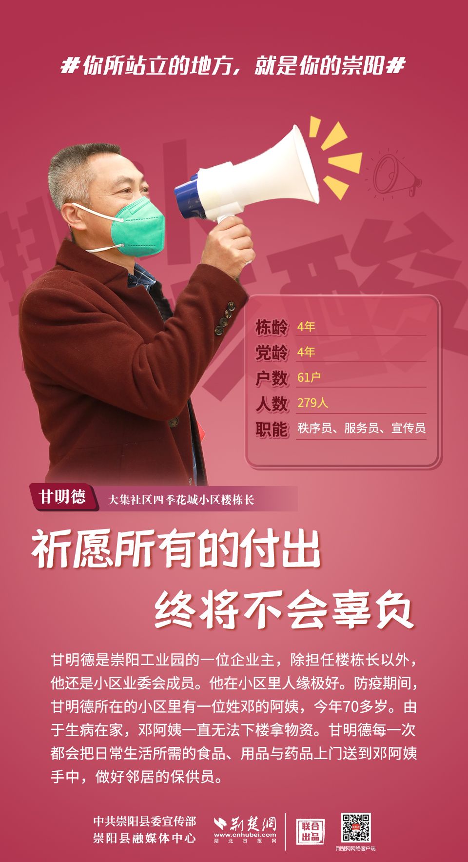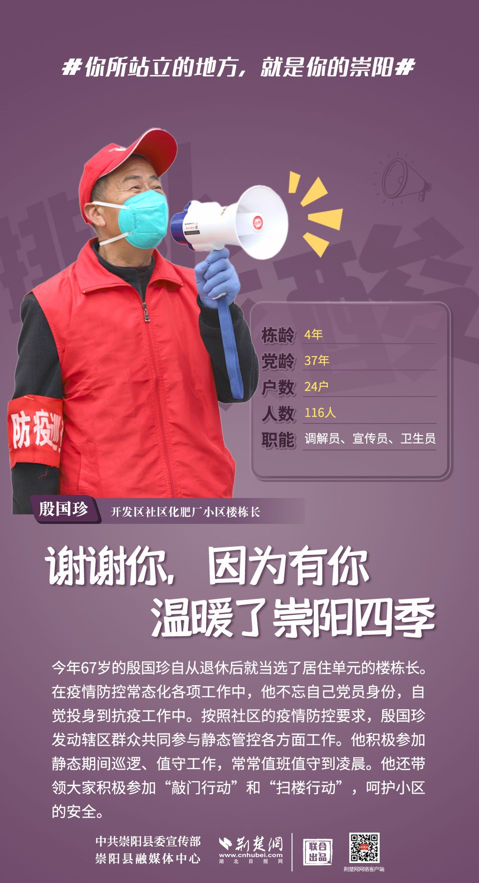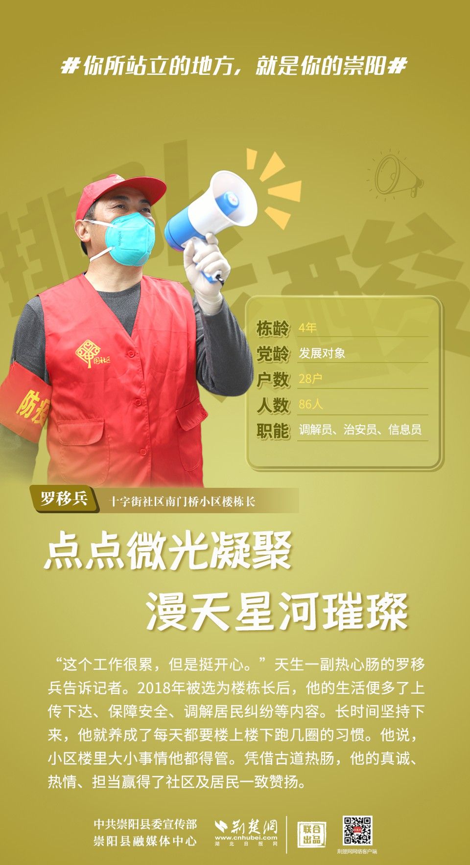 這里是青山平湖、金沙勝地的崇陽,這里是桂花林濤、洪下竹海的崇陽,這里是人文鼎盛、鐘靈毓秀的崇陽,這里還是你的、我的,美麗的家園??挂咂陂g,同舟共濟,守望相助,點亮星星的人,也能點亮世界。歲月不居,時光不老,愿你我皆能被這個世界溫柔以待。